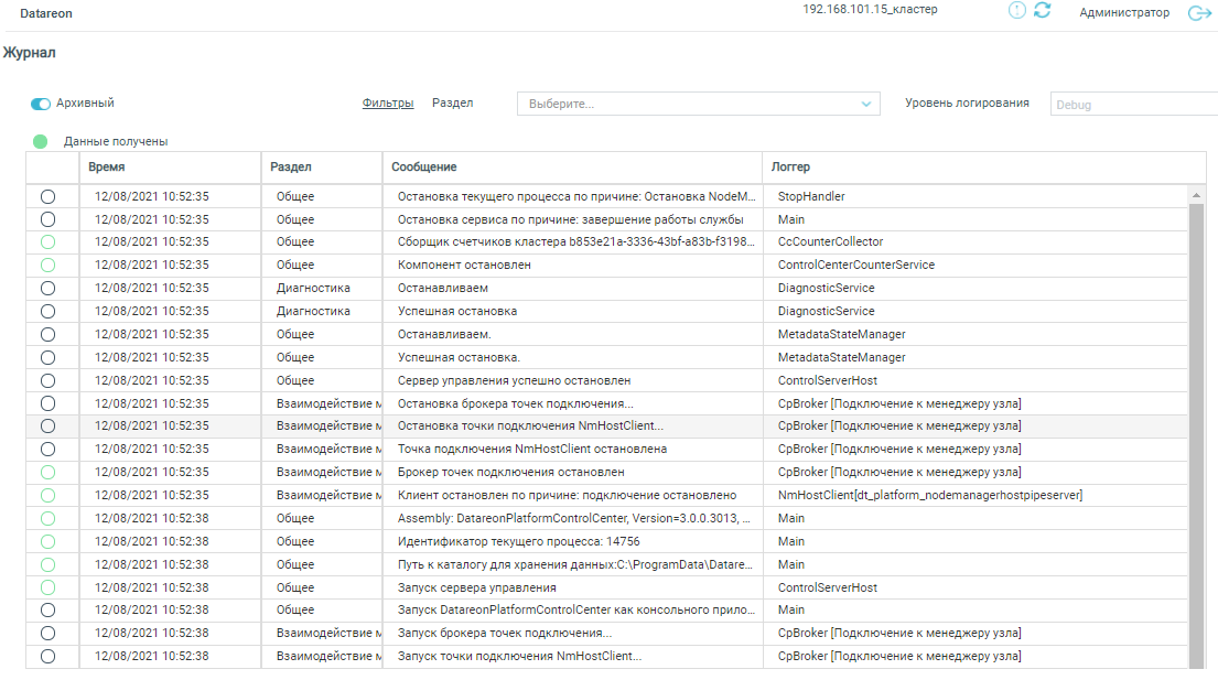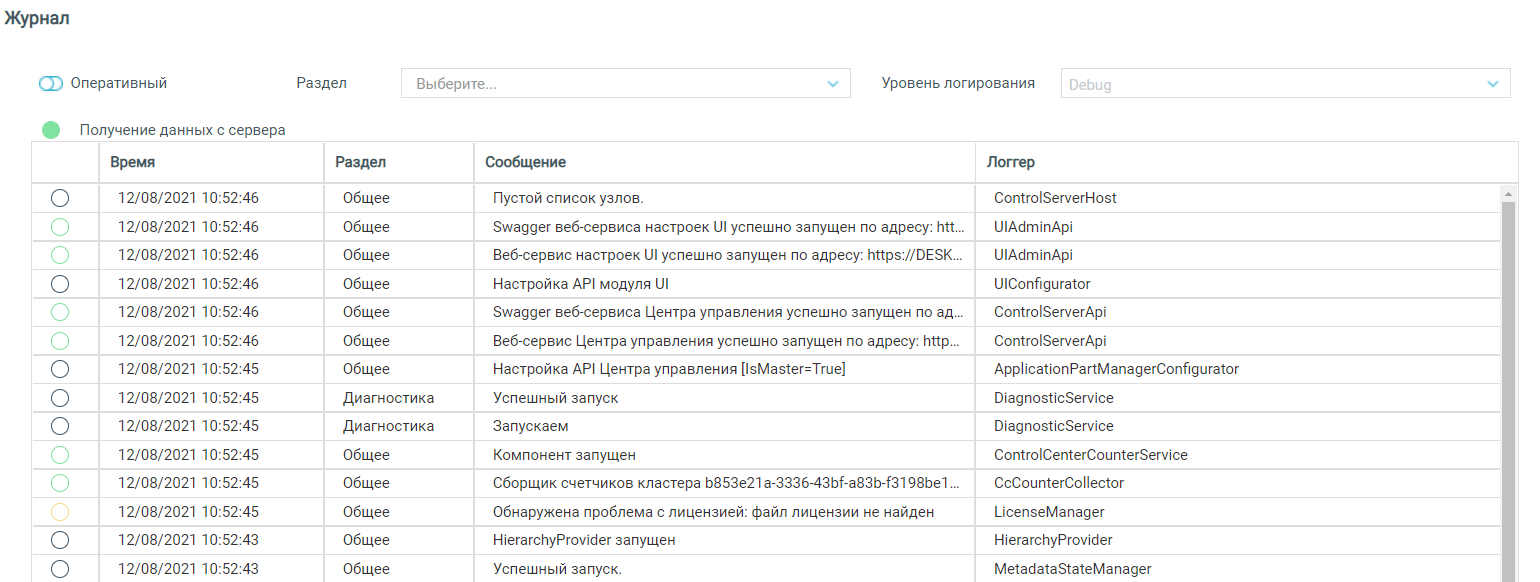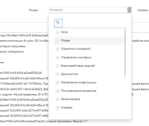 Существует 2 режима просмотра данных: оперативные и архивные. По умолчанию журнал отображает оперативные данные. Доступны следующие фильтры Раздел и Уровень логирования. В каждом фильтре предоставлена возможность быстрого поиска параметра.