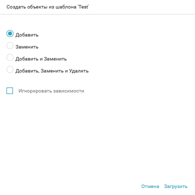 Чтобы создать объекты из загруженного шаблона, нажмите на кнопку Создать объекты из шаблона, отмеченную на изображении выше. Откроется всплывающее окно Создать объекты из шаблона: