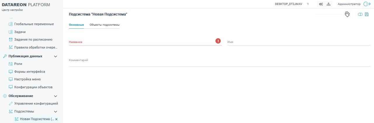 Нажмите на кнопку +. В рабочей области страницы отобразится интерфейс создания / редактирования новой подсистемы, содержащий две вкладки: Основные и Объекты подсистемы: