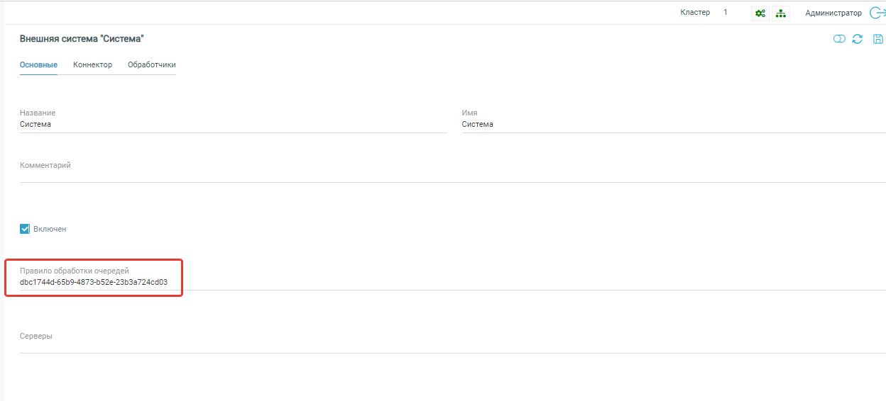 На вкладке Правило извлечения пользователь должен написать правило извлечения сообщения из очередей на C#. После создания правил необходимо их назначить системе или модулю. Например, назначьте правило для системы. Откройте существующую систему. На вкладке Основные есть параметр для заполнения Правило обработки очередей. Здесь необходимо указать идентификатор правила и сохранить правило и схему.