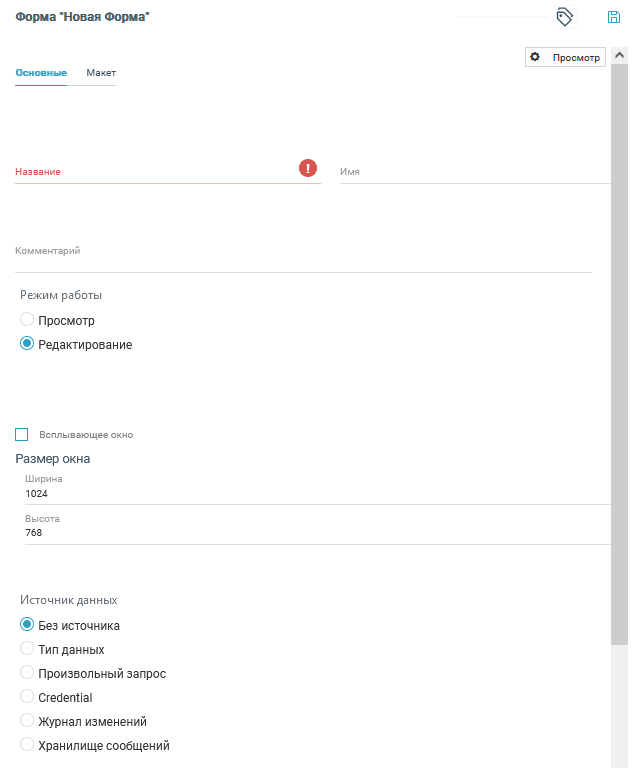 Имя - имя формы редактирования. Может содержать буквы, цифры. Пробелы и спецсимволы недоступны для использования.