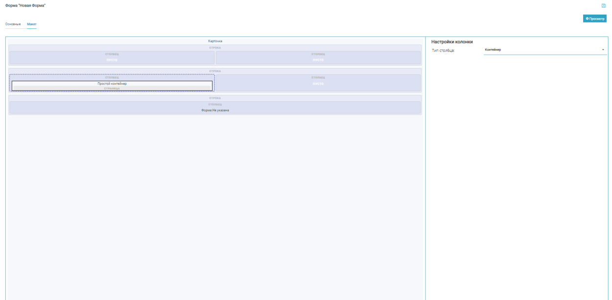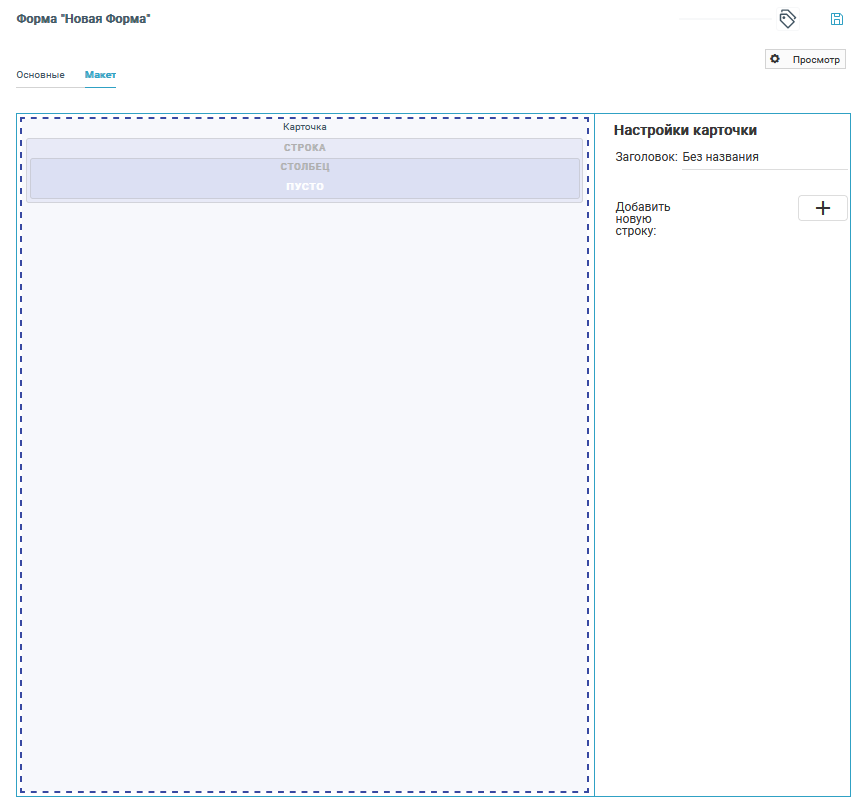 Панель действий (правый верхний угол) - панель быстрых действий с формой. В новой форме доступны только Сохранить и Закрыть. После первого сохранения появляется возможность Обновить (возврат к последнему сохраненному формату), Удалить, Просмотр (предпросмотр внешнего вида добавленных в карточку полей).