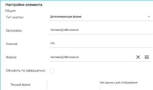 • Отправить данные - отправка указанных в форме данных выбранного типа в определятор. Поддерживает ожидание завершения (по аналогии с операциями), есть возможность указать таймаут, обновление формы по завершению выполнения БП или закрытие формы.