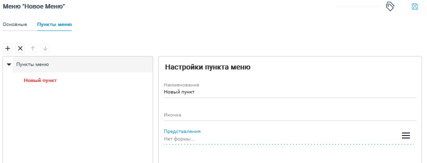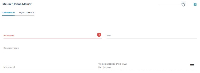2. Нажмите на кнопку +. В рабочей области страницы отобразится интерфейс создания меню, содержащий две вкладки: Основные и Пункты меню: