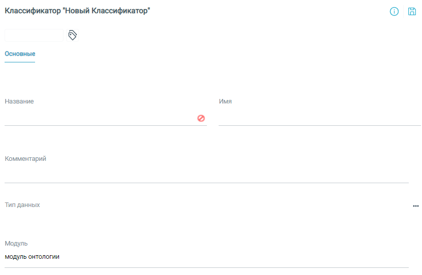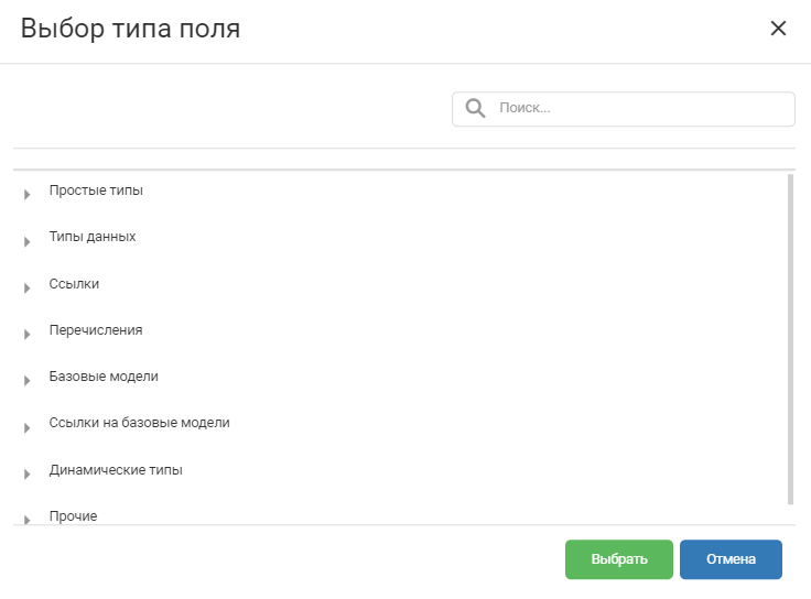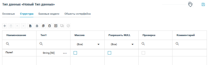 Для создания типа данных нужно выбрать в Меню->**Тип данных** и нажать на кнопку v. Система раскроет список доступных элементов для создания: