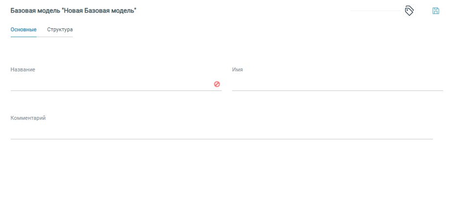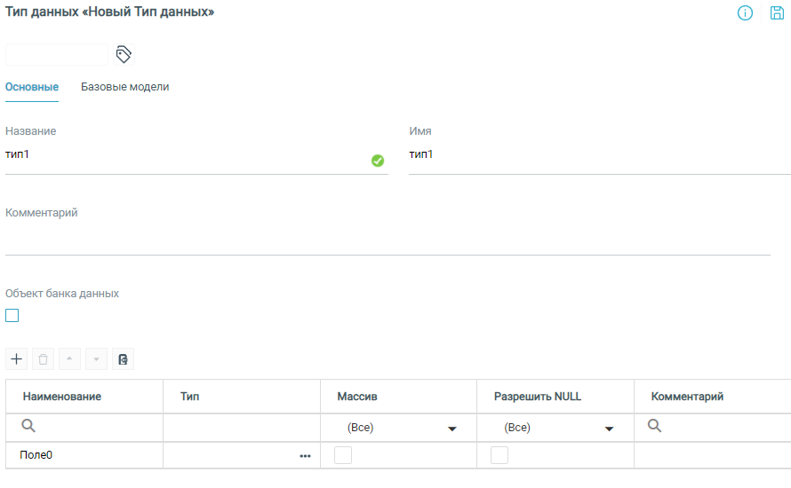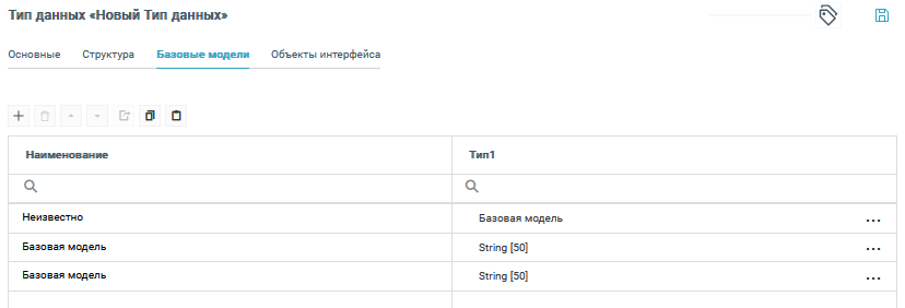 Вкладка Базовые модели содержит таблицу для внесения добавления базовых моделей и выбора типа поля: