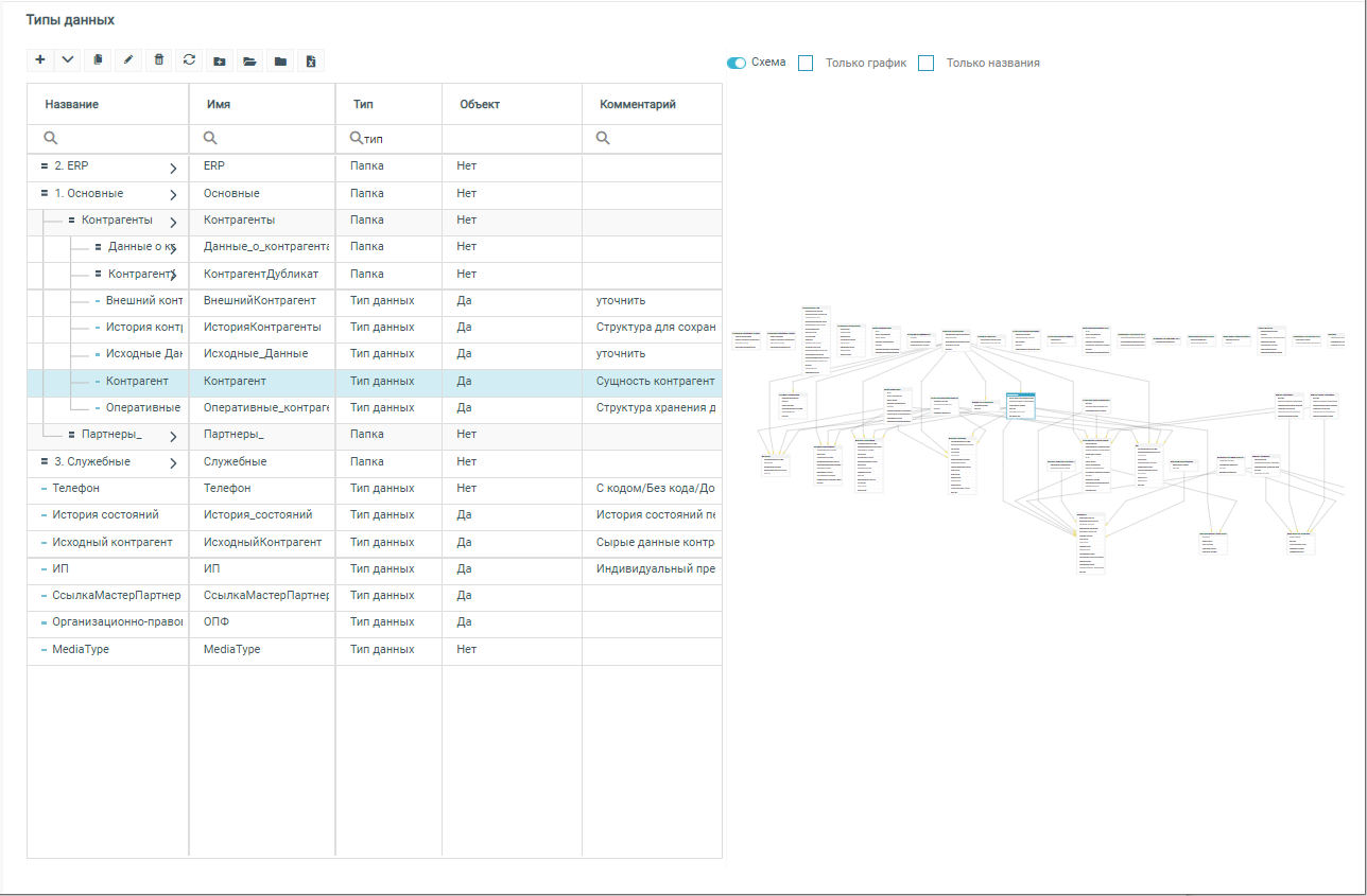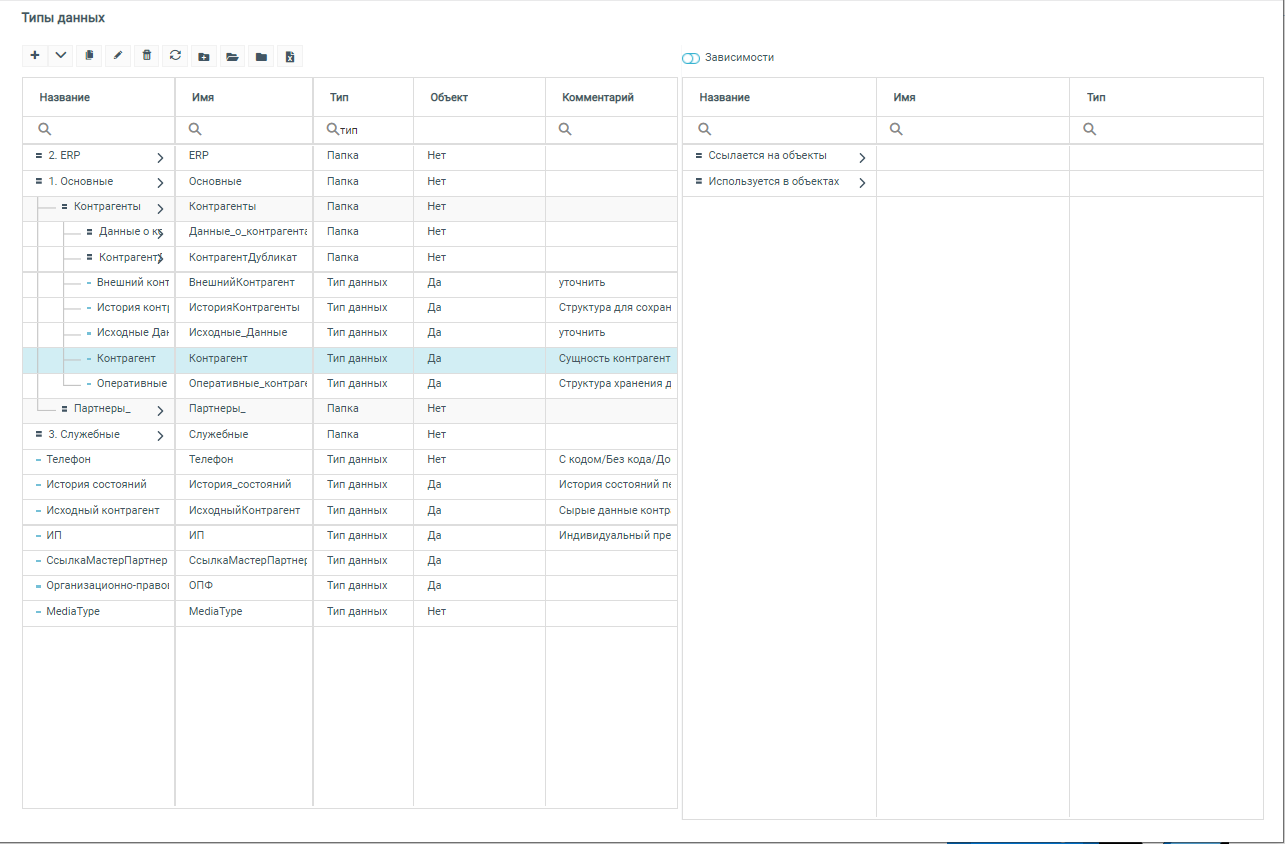 Страница Типы данных поделена на две части. В левой части находится таблица со списком типов данных, в правой выводится список зависимостей выбранного типа.