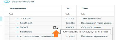 При раскрытии таблицы отображается список объектов. Нажатие на кнопку открывает вкладку слева в меню, соответствующую данному объекту:
