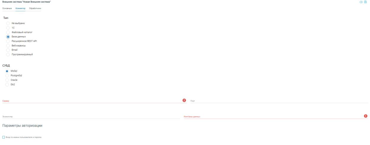 2. Нажмите на кнопку +. В рабочей области страницы отобразится интерфейс создания / редактирования новой внешней системы, содержащий три вкладки: Основная, Коннекторы и Обработчики:
