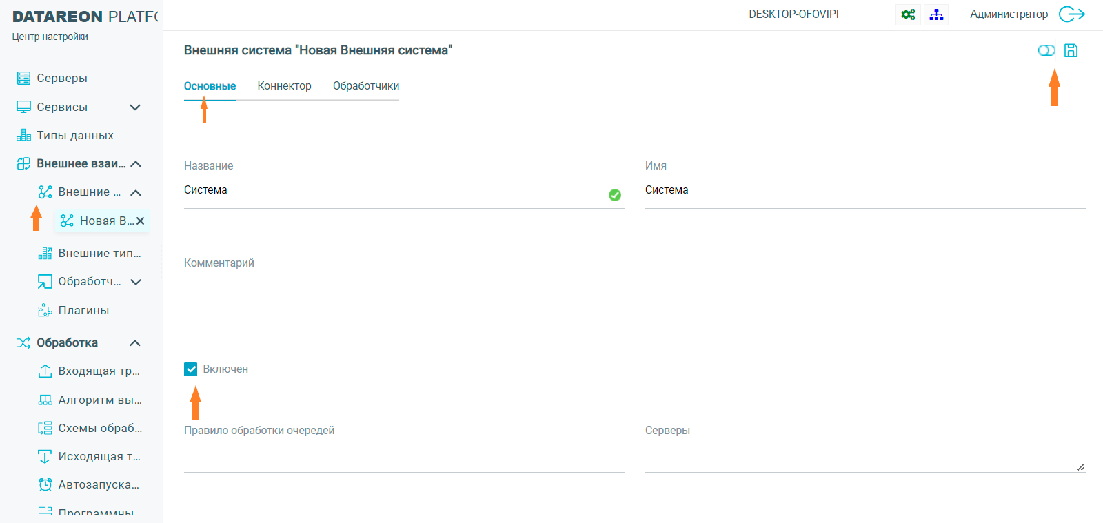 2. Нажмите на кнопку +. В рабочей области страницы отобразится интерфейс создания / редактирования новой внешней системы, содержащий три вкладки: Основная, Коннекторы и Обработчики: