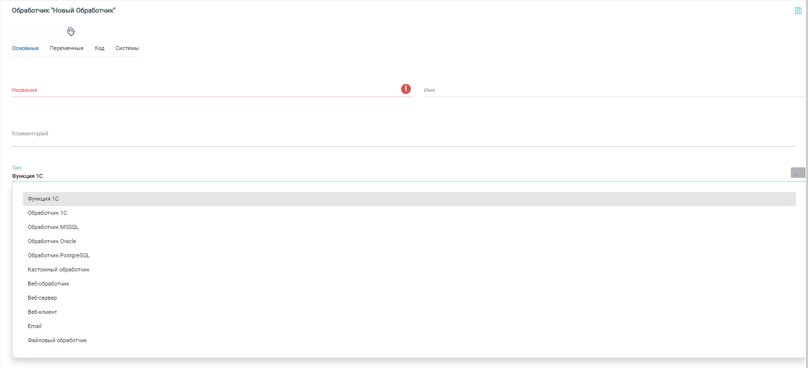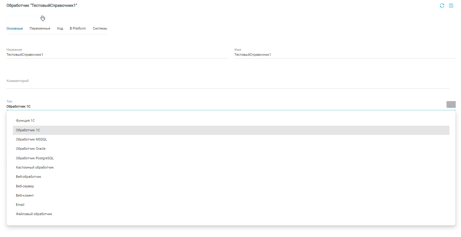 Для настройки обработчика 1С необходимо выбрать нужный тип из выпадающего списка: