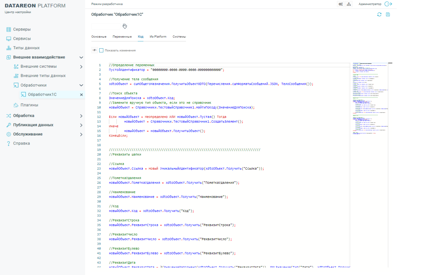 Подробнее о коде обработчиков 1С см. в разделе 7.4. API Обработчиков 1С.