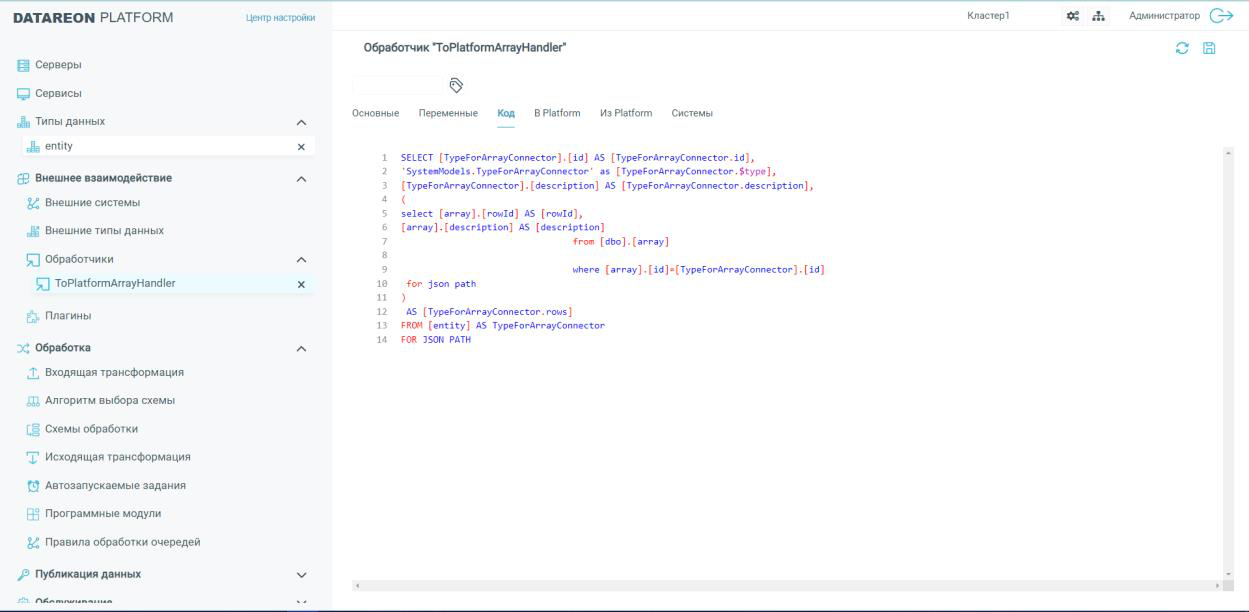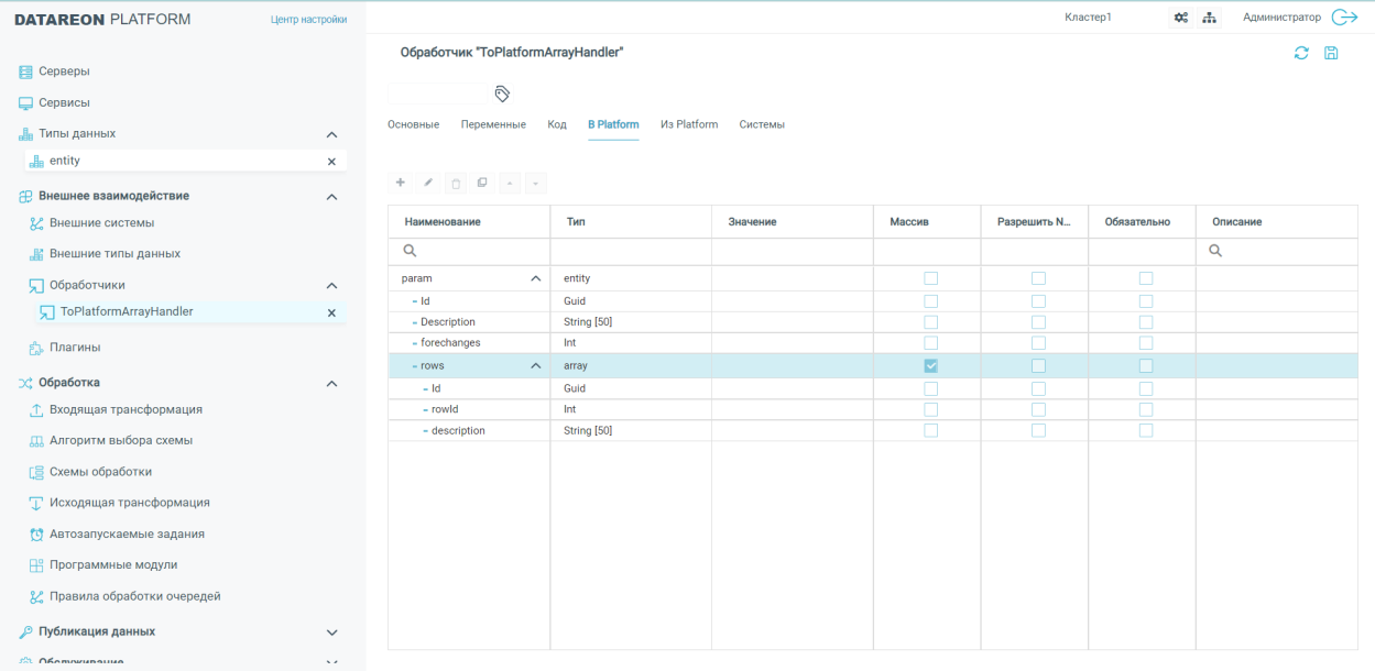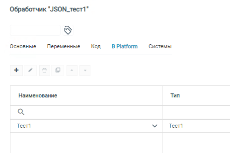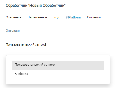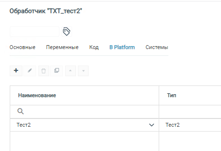 Содержит данные, которые будут передаваться из Платформы при соответствующем направлении интеграции, выбранном на вкладке Основные. На вкладках В Platform и Из Platform определяется с каким типом данных будут обрабатываться сообщения данным обработчиком. Если из Платформы пришло сообщение с типом, указанным на данной вкладке, то этот обработчик будет выбран для этого сообщения, затем выполняется код обработчика, если он есть.