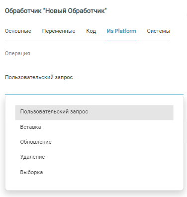Для обработчиков СУБД система предоставляет дополнительный набор операций, предназначенных для использования вместо SQL кода. В направлении Из Platform система предлагает выбрать следующие виды операций: