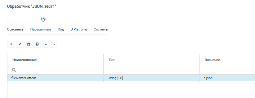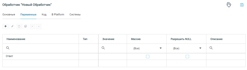 На вкладке Переменные выберите или создайте переменные для использования в обработчике, нажав на кнопку +: