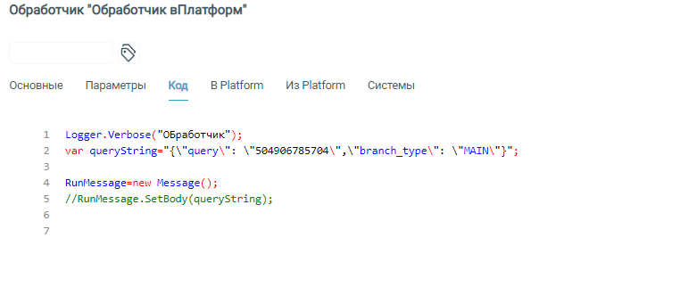 В этой переменной содержится сообщение, полученное из внешней системы. Содержимое переменной RunMessage можно модифицировать с помощью методов для работы с сообщениями. По окончании работы обработчика содержимое переменной RunMessage отправляется в Платформу.