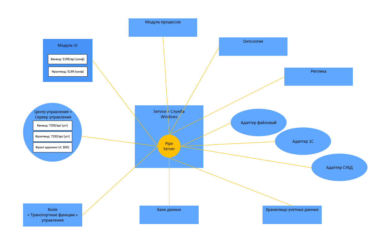 При работе с Платформой доступны для подключения следующие модули: - Модуль процессов. - Модуль онтологии. - Модуль репликации. - Банк данных. - Хранилище учетных данных. - Модуль UI (web-интерфейс публикуется на порту, указанному в настройках модуля).