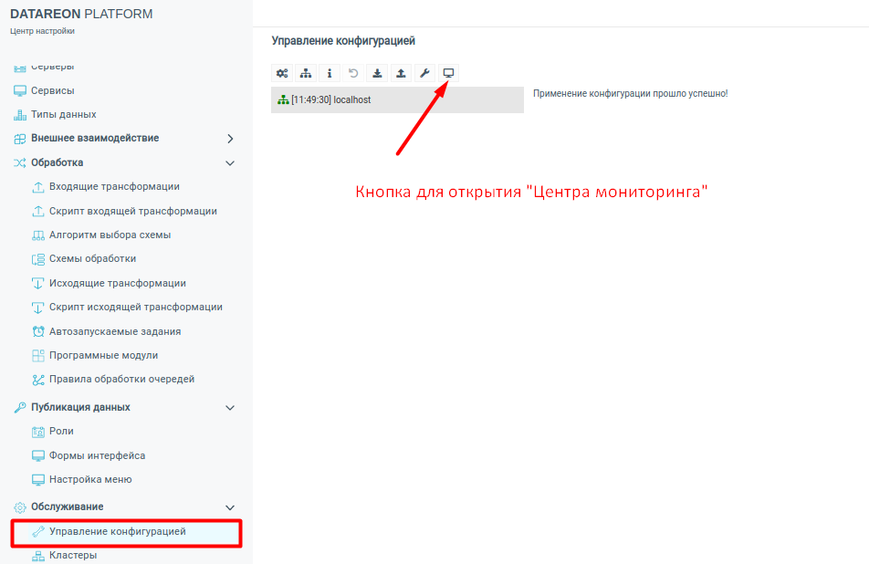 #. Нажмите на кнопку Применить конфигурацию. После сообщения об успешном применении конфигурации станет доступен Центр мониторинга, в котором отображается актуальная информация о работе Кластера.