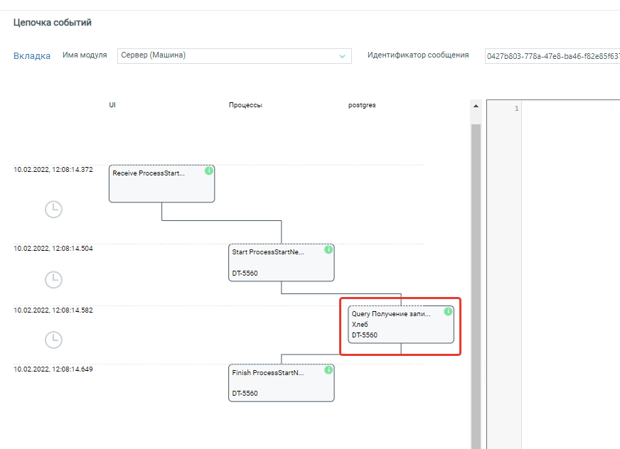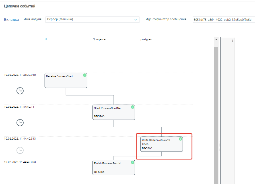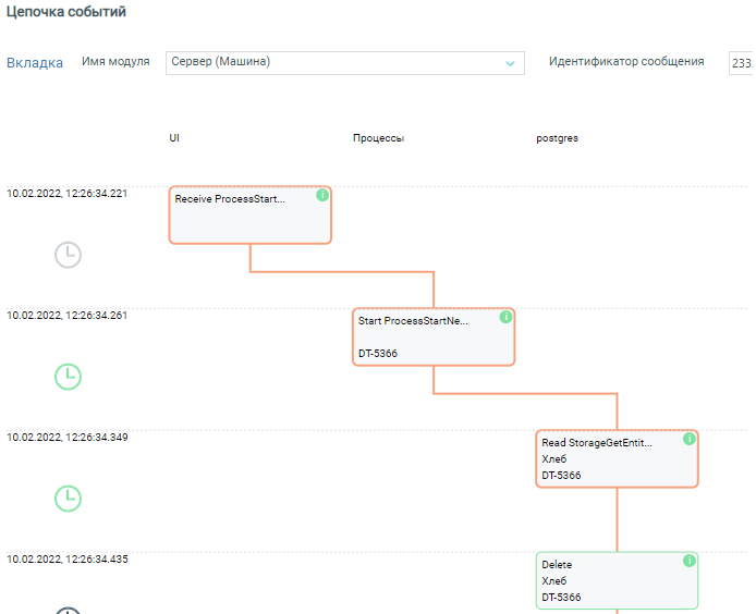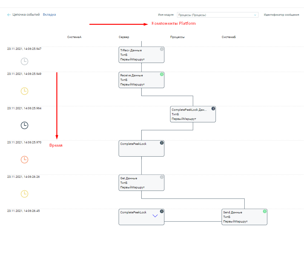 Для графического представления пути передачи и обработки сообщения в Платформу автоматически строится Цепочка событий. Цепочка событий представляет собой блок-схему этапов передачи сообщения с возможностью просмотра подробной информации о событии. На вертикальной оси блок-схемы отображается время события, на горизонтальной оси отображены модули Платформы, участвующие в событии: