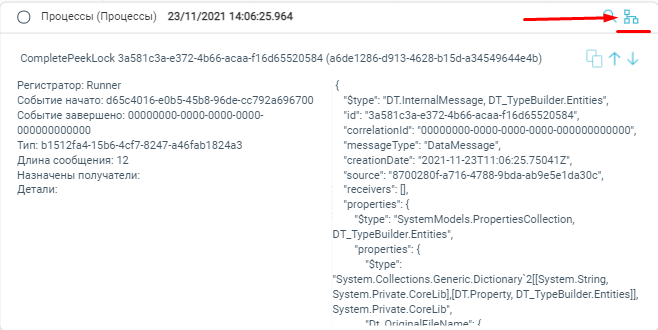 Просмотр Цепочки событий доступен в Центре мониторинга из журнала События. По нажатии на событии, относящемуся к рассматриваемому сообщению, открывается подробная информация о событии. В окне подробной информации справа вверху есть значок графа. По нажатии на значок графа откроется Цепочка событий конкретного сообщения: