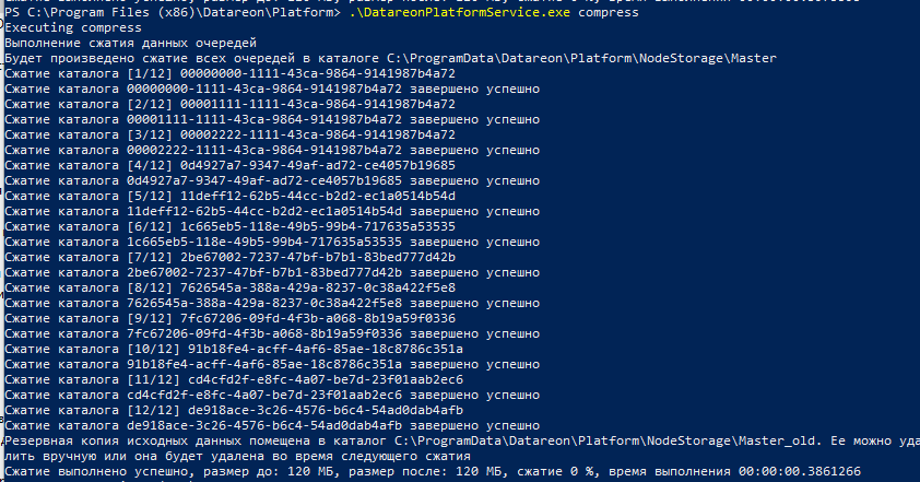 Команда compress для DatareonPlatformService.exe. Без опций сжимает весь каталог с очередями.