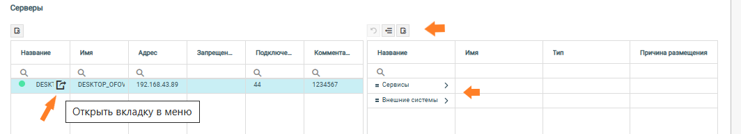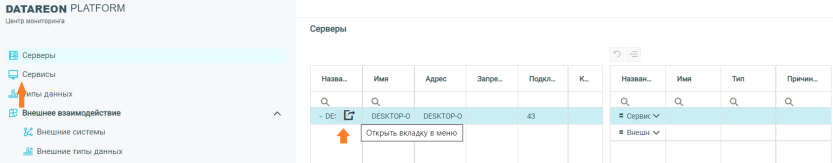 Для каждого сервера справа есть таблица с подключенными сервисами и внешними системами. Можно раскрыть любой из этих двух списков и при необходимости вывести мониторинг по данному объекту двойным щелчком мыши на строке или открыть вкладку в меню, нажав на кнопку: