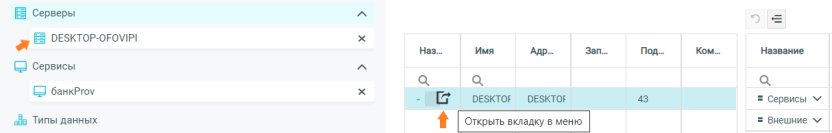По кнопке Открыть вкладку в меню открывается вкладка в меню Сервер: