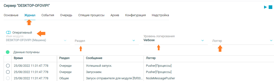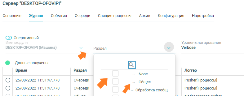 На вкладке с режимом Оперативный присутствуют фильтры в виде выпадающих меню: Раздел, Уровень логирования и Логгер. Эти фильтры позволяют настроить требуемую выборку.