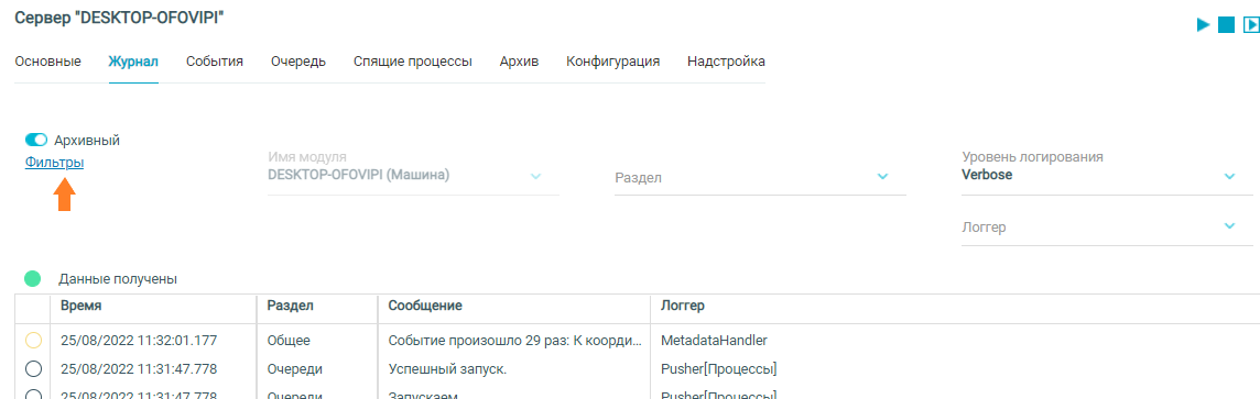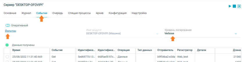 На вкладке События информация связана напрямую с событийными сообщениями. Этапы события отображаются последовательно. В раскрытой вкладке можно выбрать режим Оперативный или Архивный, задать Уровень логирования или указать Фильтр отбора данных: