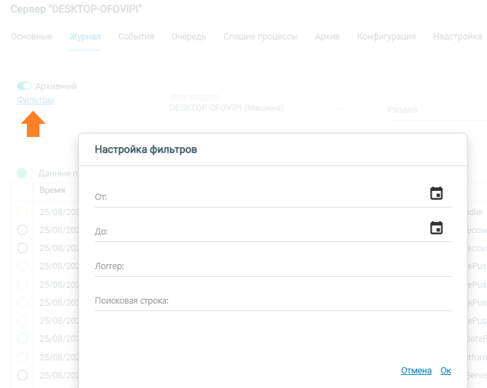 Ссылка Фильтры позволяет задать интервал выборки, логгер или определить поисковую строку: