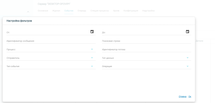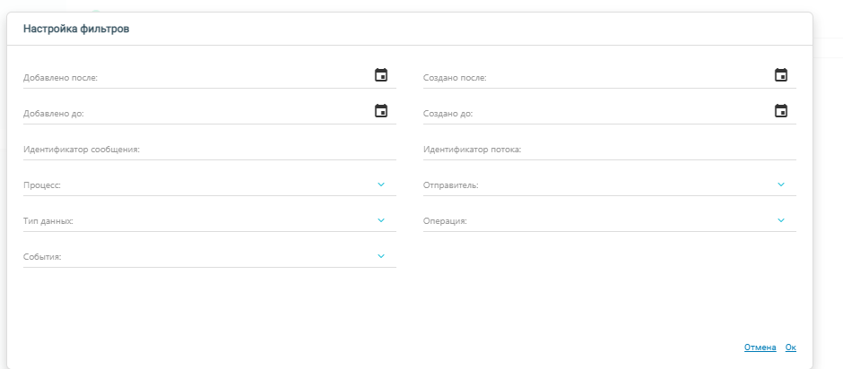Можно задать интервал выборки, идентификатор сообщения, идентификатор потока или задать условия выборки в выпадающих списках: Отправитель, Тип данных, Тип события, Операция.