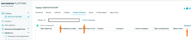 На вкладке можно просмотреть сведения о процессах в режиме ожидания и их количестве. Для детального отобраения сведений можно задать GUID процесса и шаг процесса; справа находится кнопка Обновить: