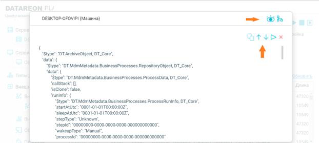 Нижние пять кнопок справа вверху позволяют: скопировать детализацию, используя стрелки перейти к детализации предыдущего / последующего сообщения, вернуть сообщение в обработку или удалить его. Верхние две кнопки справа вверху обеспечивают: просмотр сообщения в режиме полного экрана и просмотр Цепочка событий. При нажатии на кнопку Цепочка событий отобразится графическая схема цепочки событий: