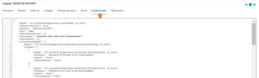 На вкладке Конфигурация можно просмотреть параметр config для данного сервера: