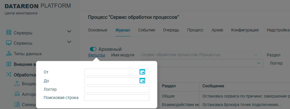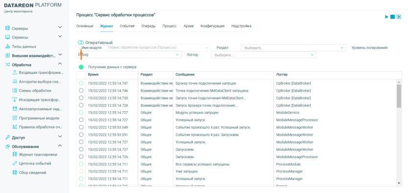 В Журнале отображается информация, связанная с работой сервиса. Здесь отображаются события, не связанные напрямую со штатной обработкой сообщений; это информация по работе, запуску, остановкам, сбоях при подключении, состояние работающих элементов сервиса и т.д.