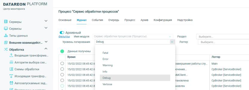 Вкладка Логирование позволяет заменить текущие уровни логирования для журналов, событий и их архивов.
