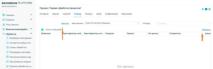 Вкладка Очередь показывает очередь незавершенных процессов для выбранного сервиса: