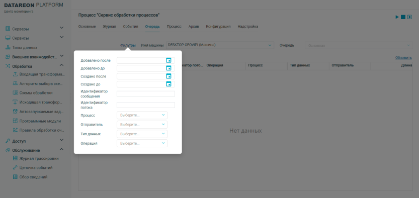На вкладке Очередь мы можем указать фильтр отбора сообщений: