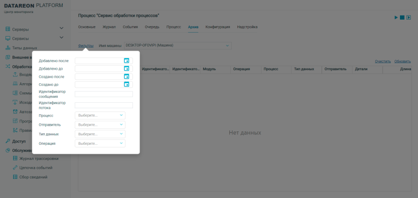 Вкладка Процессы отображается для сервисов, при создании которых было в настройке было указано Обработка данных и сообщений.