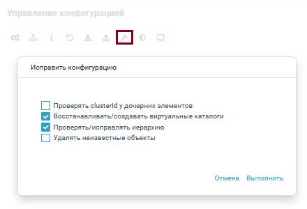 Перед началом установки обновления сохраните резервную копию конфигурации Платформы. После завершения установки необходимо исправить конфигурацию. Для этого откройте раздел Управление конфигурацией в Центре настройки и нажмите на кнопку Исправить конфигурацию. В открывшемся окне установите флажки Восстанавливать/создавать виртуальные каталоги и Проверять/исправлять иерархию, после чего нажмите на кнопку Выполнить: