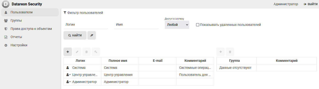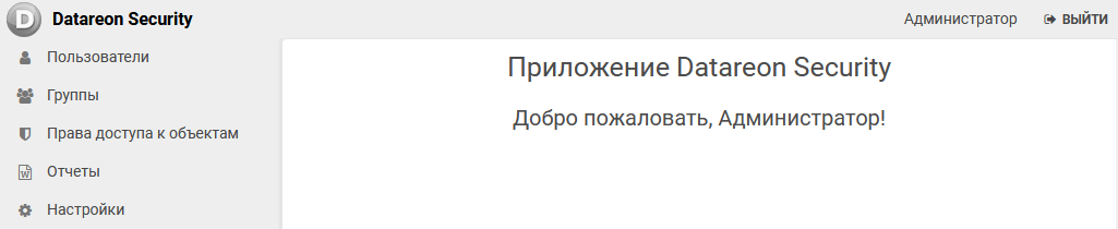 При успешной авторизации откроется окно консоли управления доступом Datareon Security: