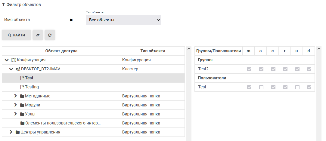 Настройки позволяют просматривать права, выданные пользователям и пользовательским группам для доступа к объектам системы.