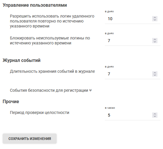 В рабочей области страницы находятся следующие дополнительные настройки управления доступом к Платформе, журнала событий и прочие настройки: