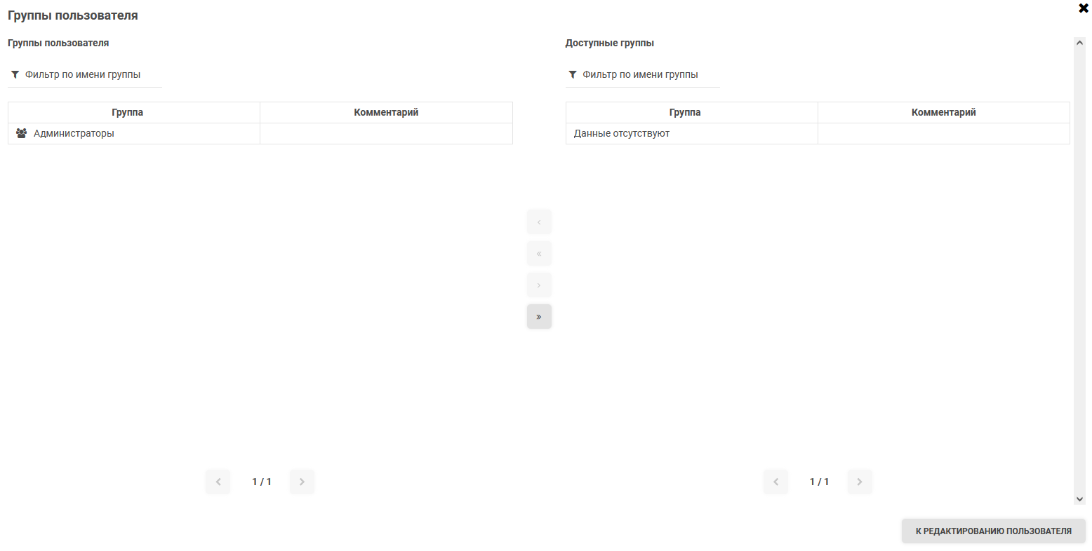 Чтобы добавить пользователя в определенные группы, выделите их в таблице справа и нажмите на кнопку <. Пользователь будет добавлен в выбранные группы.