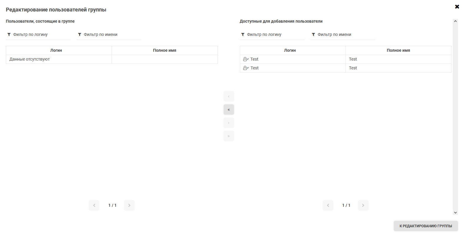 В окне отображены две таблицы: слева находится таблица со списком пользователей, которые входят в группу, а справа находится таблица со списком доступных пользователей для включения в группу. Возможна фильтрация отображения пользователей в списках по имени и по логину.