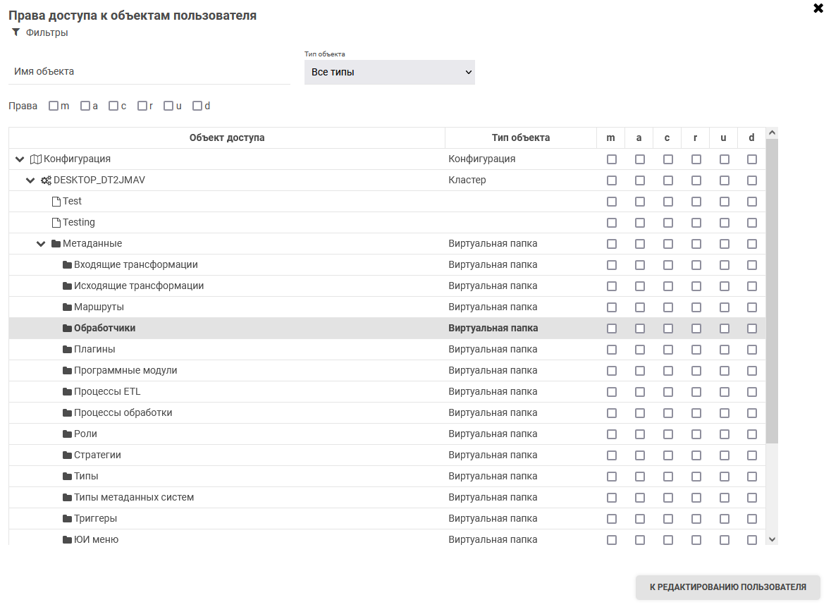 Для установления прав доступа, выберите строку объекта и установите необходимые флажки для выбора прав доступа пользоателя к выбранному объекту: