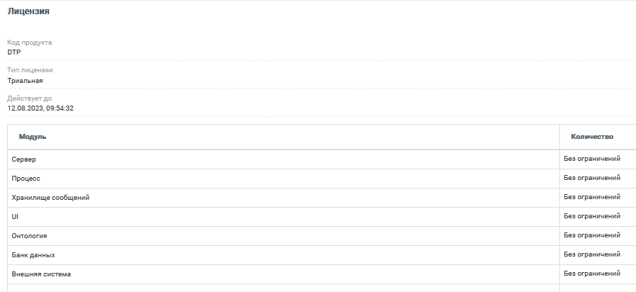 • Таблица, содержащая список модулей, которые можно использовать в рамках текущей лицензии и их количество. В случае остутствия ограничений на количество используемых модулей отображается значение Без ограничений.