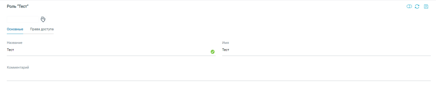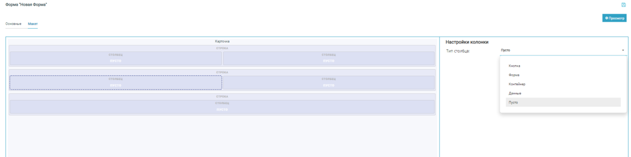 Панель действий (правый верхний угол) - панель быстрых действий с формой. В новой форме доступны только Сохранить и Закрыть. После первого сохранения появляется возможность Обновить (возврат к последнему сохраненному формату), Удалить, Просмотр (предпросмотр внешнего вида добавленных в карточку полей).