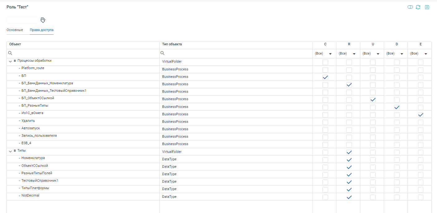 Для ролей поддерживается возможность устанавливать права CRUDE на следующие объекты доступа: