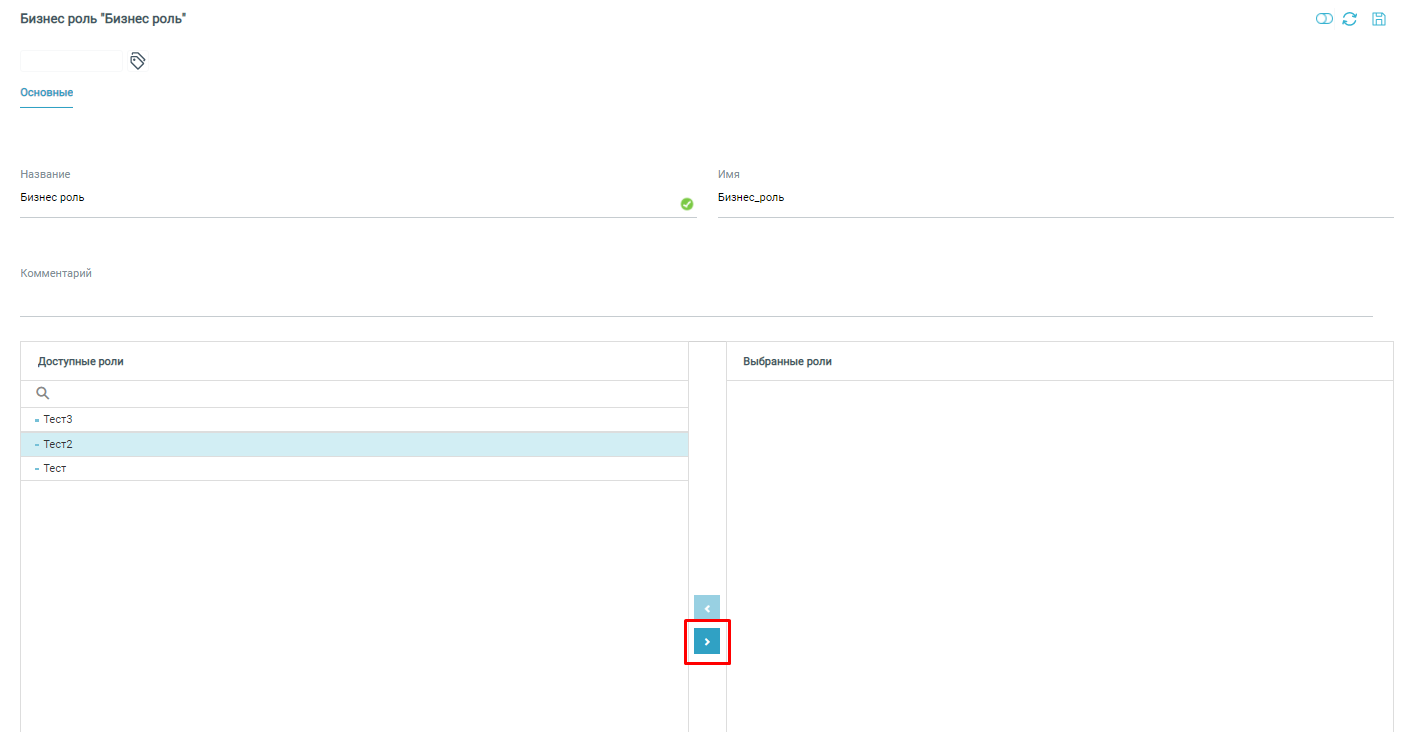 Для определения ролей для этой бизнес-роли, в левой части таблицы выберите роль и нажмите на кнопку ᐳ.